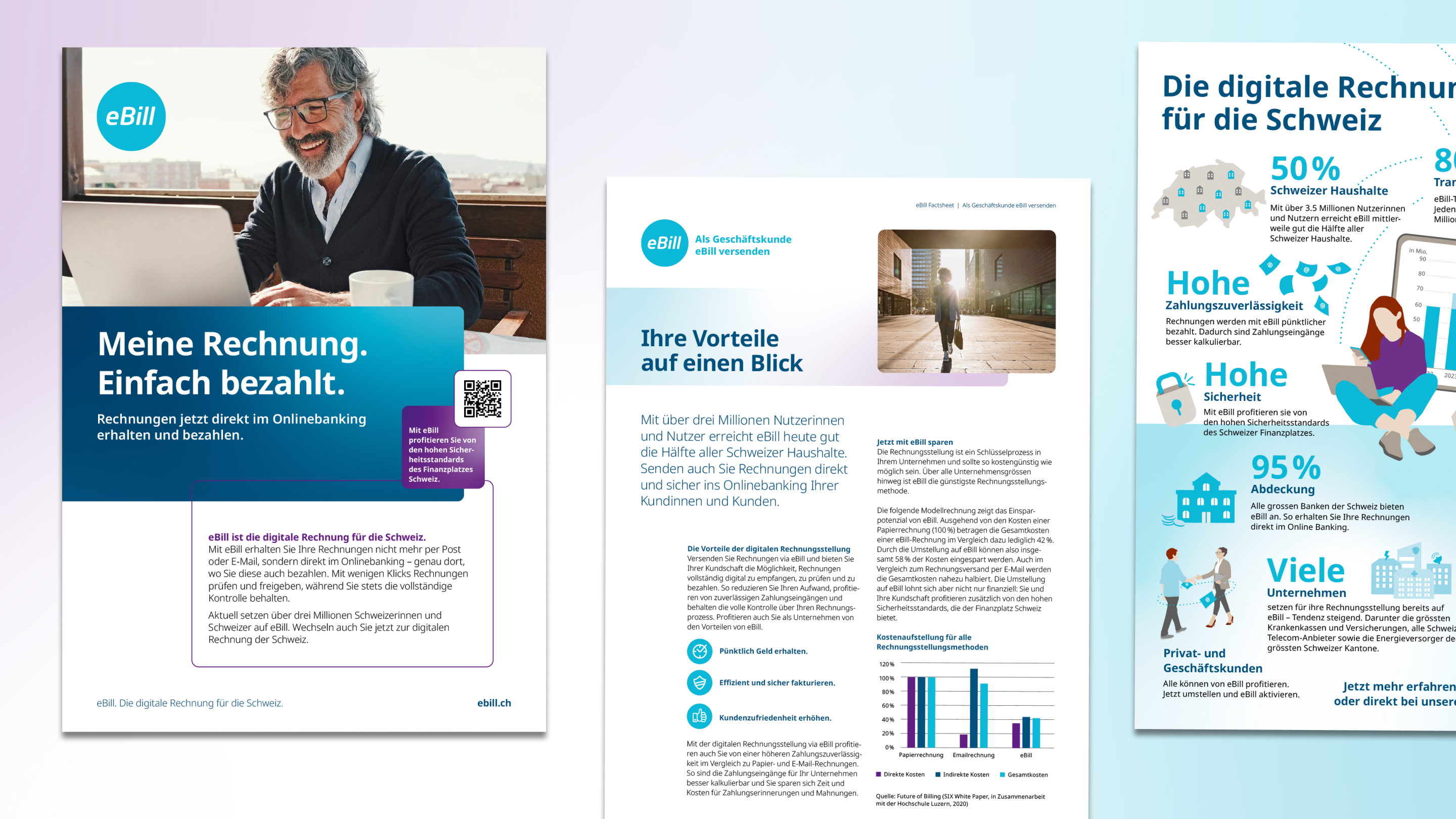 Mit ein paar Klicks eBill im E-Banking einrichten, danach alle Rechnungen eines Absenders direkt im Onlinebanking erhalten, Rechnungen mit minimalstem Aufwand bezahlen und auch nie mehr eine vergessen: Der digitale Rechnungsstandard von SIX überzeugt die Nutzenden durch maximale Einfachheit, Sicherheit und Übersichtlichkeit. So geht Rechnung heute.