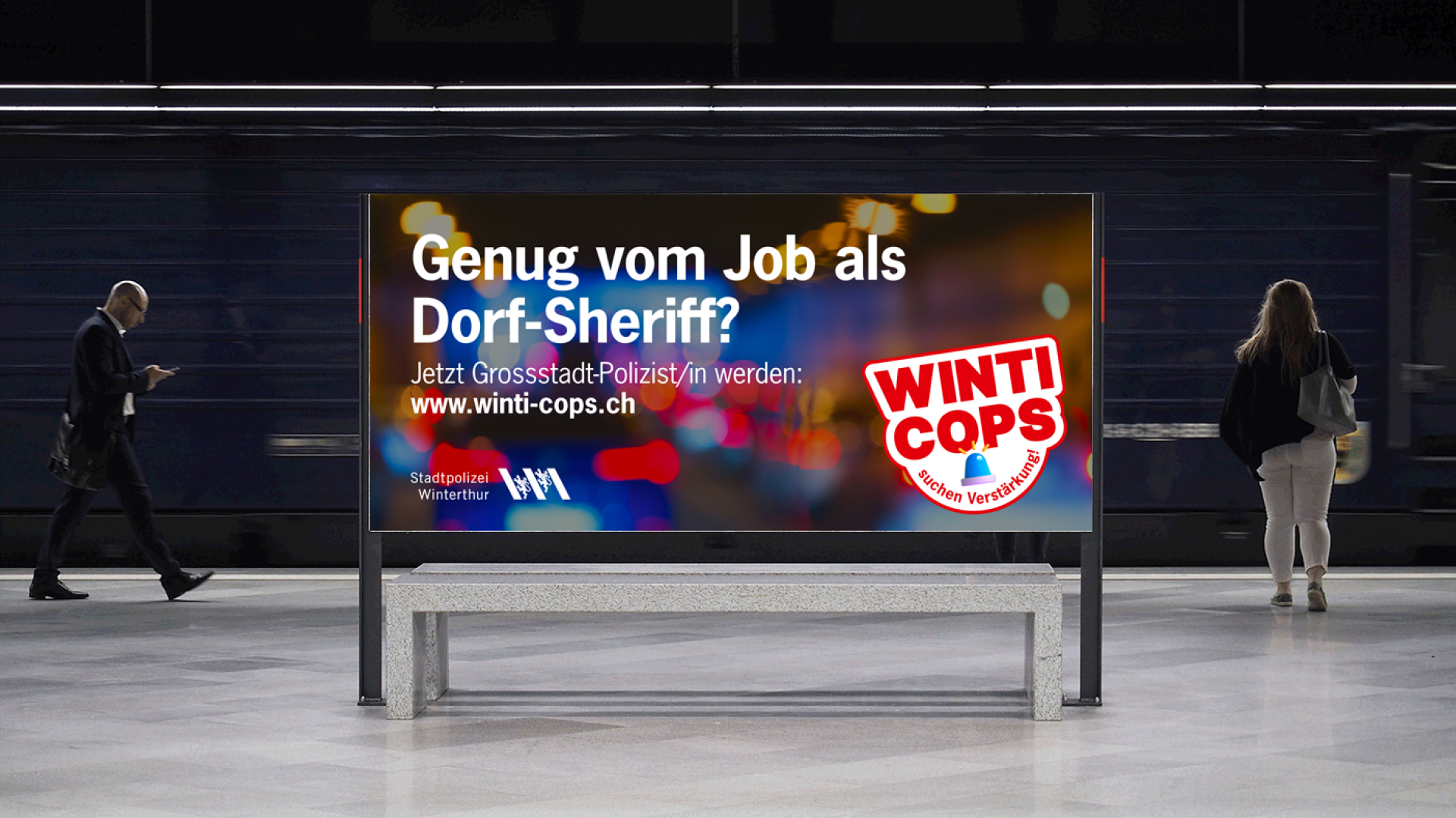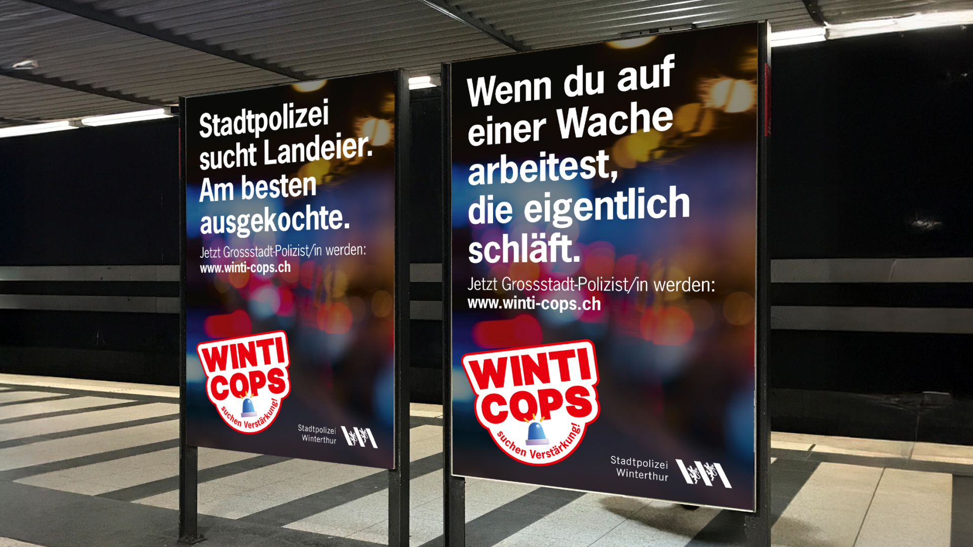 Unter dem Label «Winti Cops» lockten wir ausgebildete Polizistinnen und Polizisten aus anderen Gemeinden nach Winterthur. Wir provozierten mit Headlines wie «Genug vom Job als Dorf-Sheriff?» und platzierten die Sujets auf Plakatstellen in unmittelbarer Nähe anderer Korps. Abwerbung, aber auf sympathisch und lustig. Die Kampagne wirkte und die Stadtpolizei konnte Polizist:innen für sich gewinnen, sie brachte ein grosses Medienecho und noch heute ist die Bezeichnung «Winti Cops» in aller Munde.