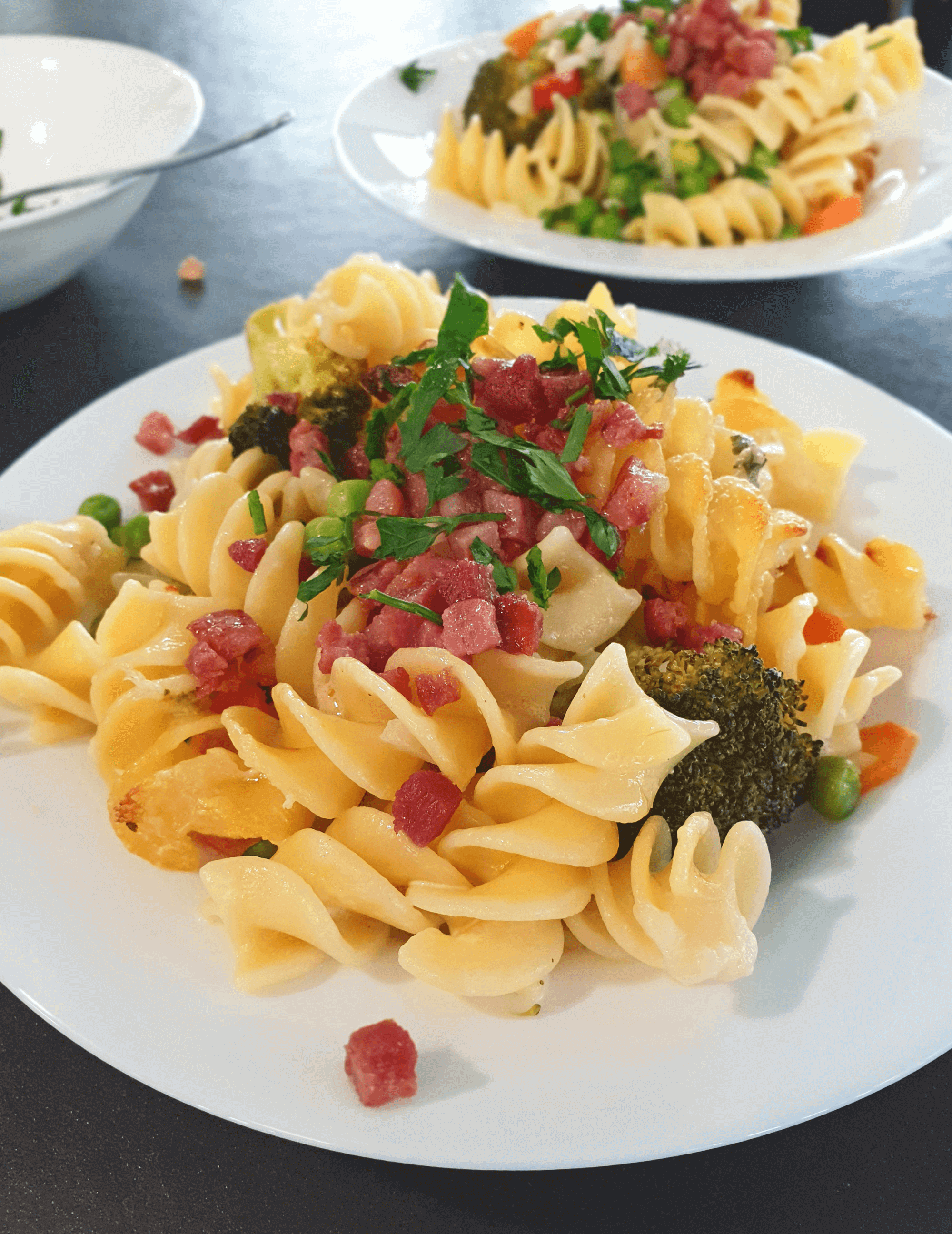 Fussilone mit dem Gemüse mischen, Erbsen, Zitronen und Petersilie dazugeben und grosszügig mit Olivenöl beträufeln. Zum Schluss alles mit dem Sud aus Weisswein und Vollrahm (mit Salz und Pfeffer abgeschmeckt) übergiessen, mit Parmesan bestreuen und 15 Minuten im Backofen fertigstellen. Speckwürfeli anbraten und ganz zum Schluss über den Auflauf verteilen.
