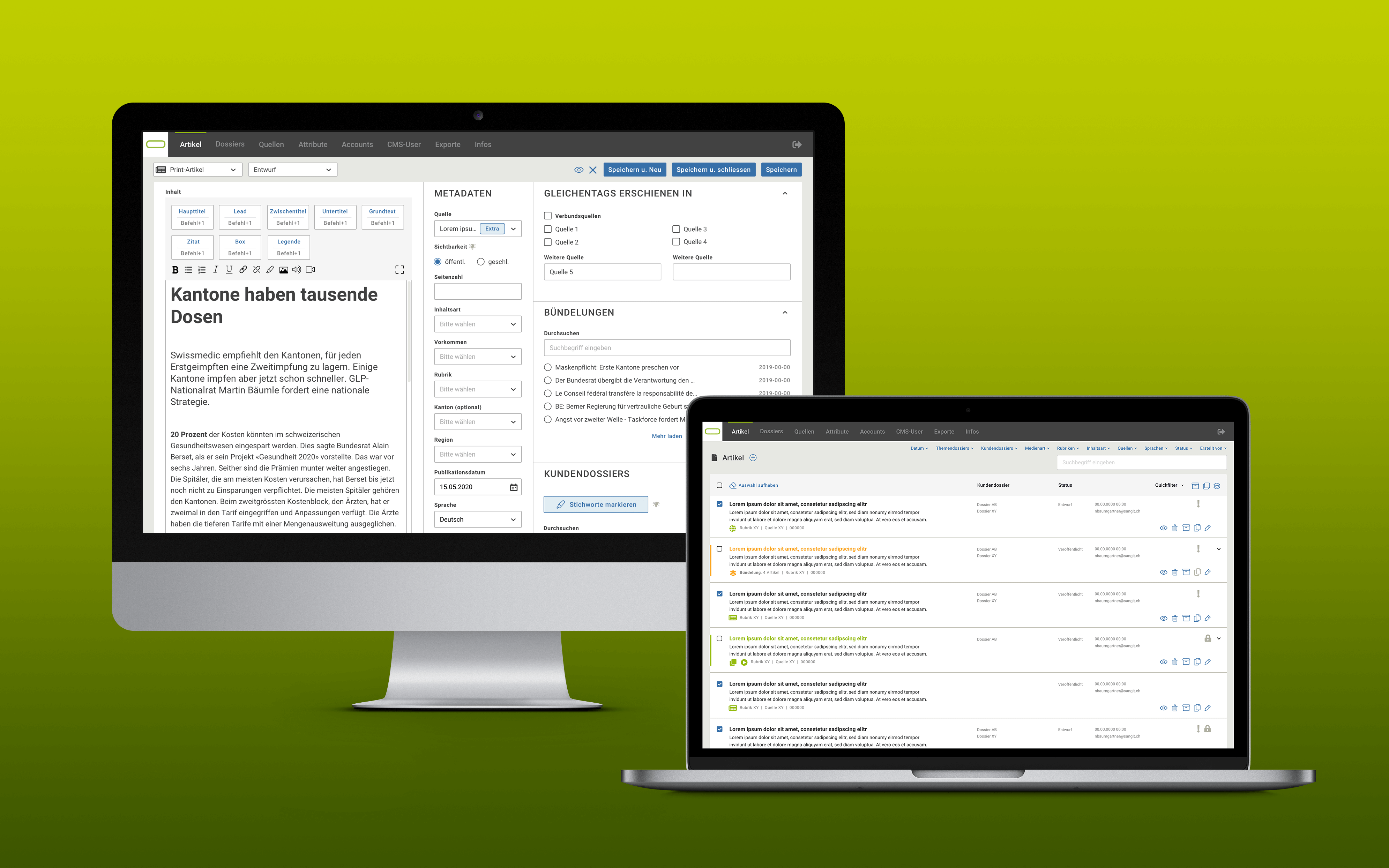 Zudem hat Partner & Partner eine weitere Nutzergruppe in die Umsetzung der neuen Plattform miteinbezogen: Wo ein Empfänger, da ein Sender – infonlinemed soll schliesslich nicht nur die Abonnenten der Medienspiegel bedienen, sondern auch für die frühaufstehenden Redaktorinnen und Redaktoren von sangit communication ag stimmige Handhabe bieten. So wurde auch ihr Feedback zum Content-Managment-System kontinuierlich eingeholt und in den Umsetzungsprozess eingeschlauft.