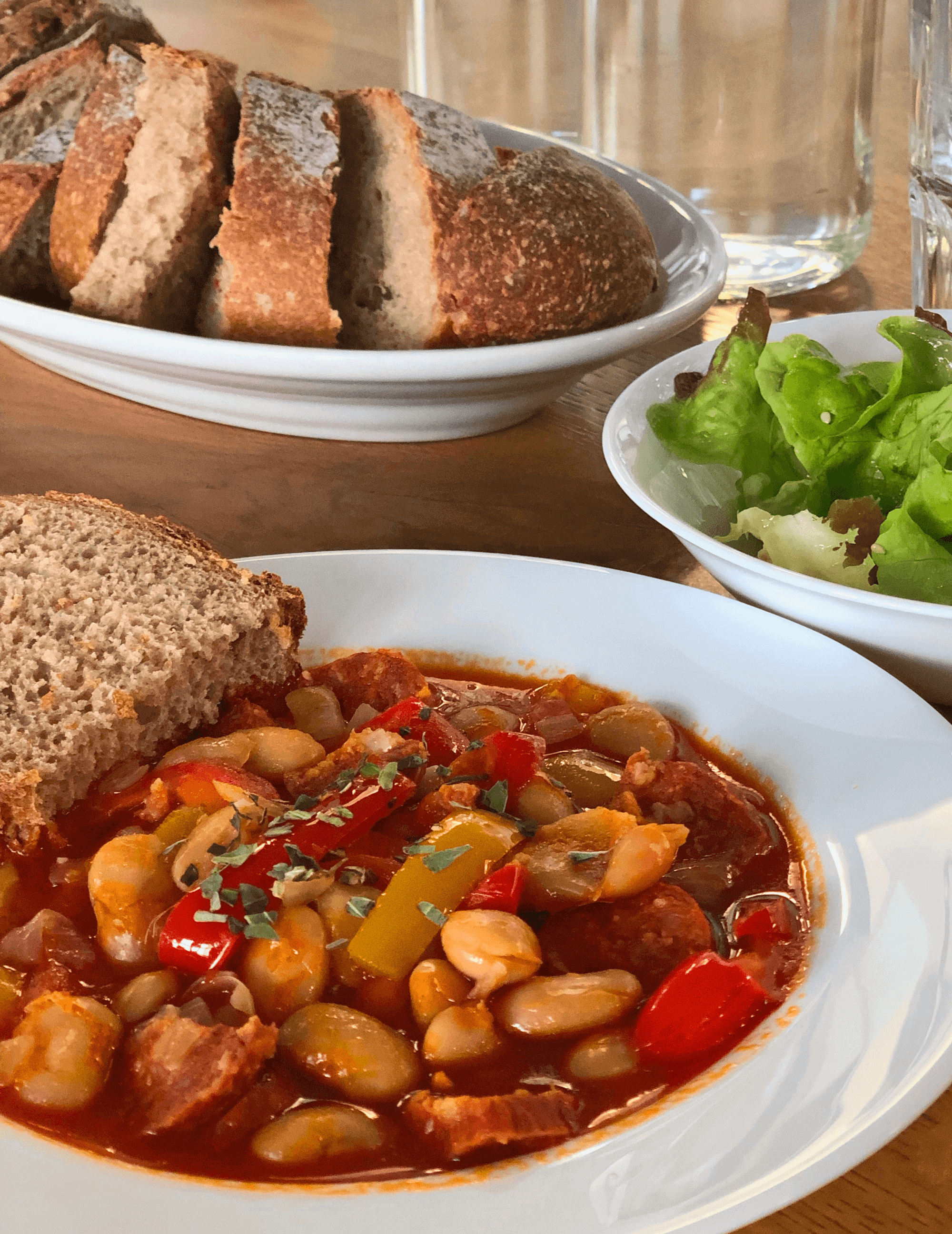 Bohnen und die vorgekochten Kartoffeln und Karotten beigeben, mischen und weiterkochen lassen. Je nachdem noch etwas Bouillon hinzugeben, damit alles in der «Suppe» schwimmt. Mit Brot servieren.