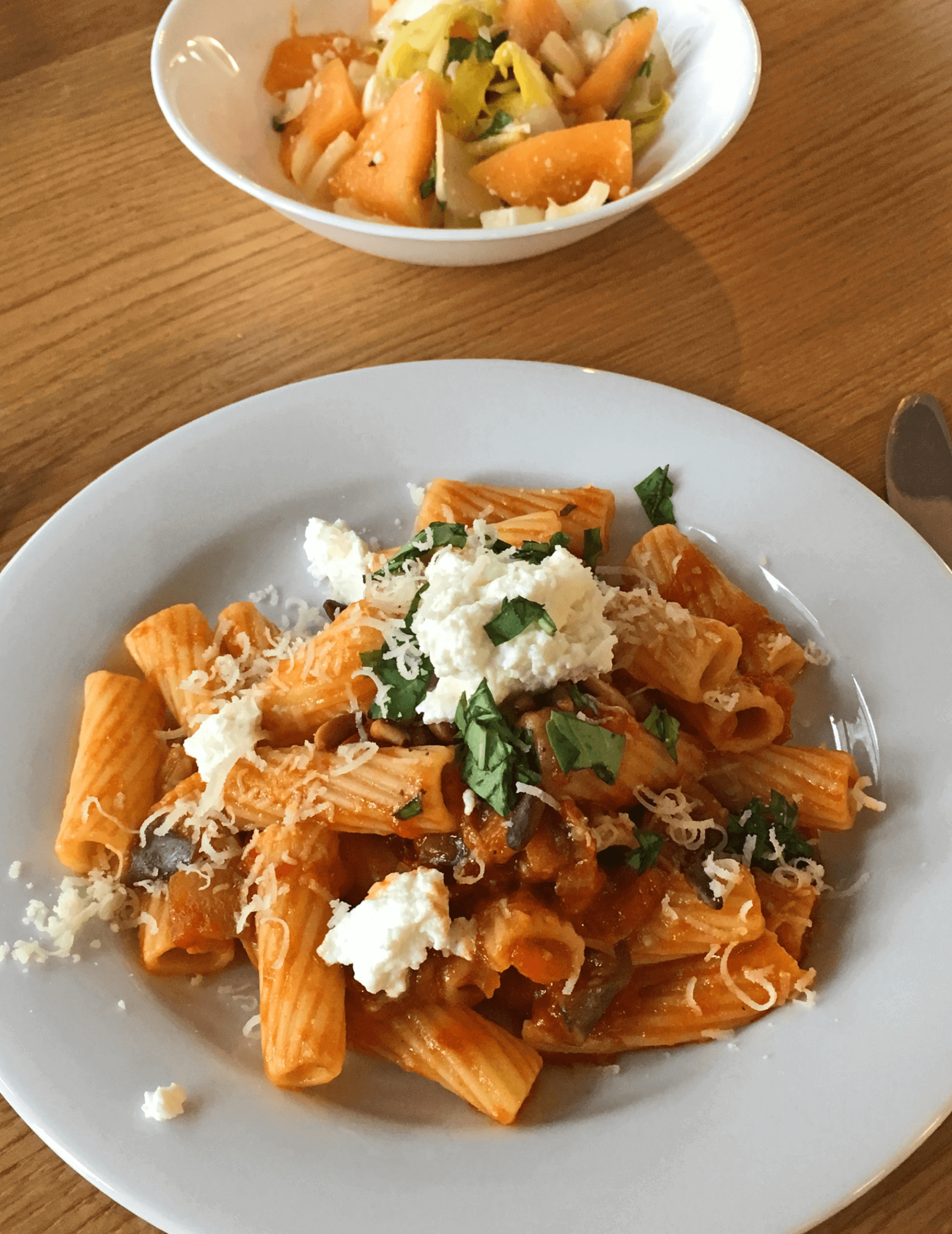 Rigatoni al dente kochen. Zwiebeln in Olivenöl glasig andünsten, Pelati dazugeben und köcheln lassen. Bereitgestellte Auberginen in die Tomatensauce geben, nach Belieben würzen und mit Salz und Pfeffer abschmecken. Kapern und Tomatenpüree beigeben und gut umrühren. Rigatoni mit der Sauce mischen und auf Tellern anrichten. Etwas Ricotta dazugeben, mit frischem Parmesan und dem zerkleinerten Basilikum bestreuen und noch etwas geröstete Pinienkerne darüber verteilen.