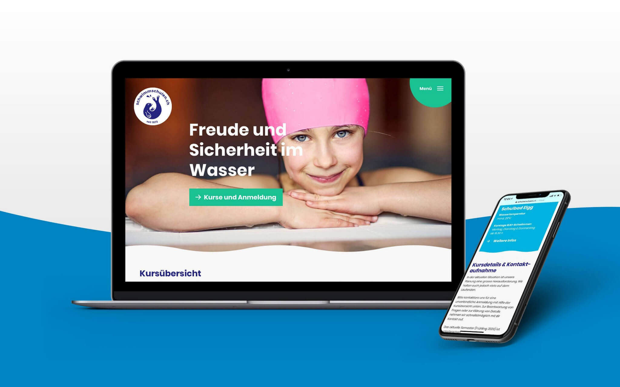 Unser Rebranding verjüngt das optische Gesamtbild der zertifizierten Schwimmschule, die langjährige Erfahrung als qualitatives Kernelement bleibt dabei zentral. Das neue Logo ist schlanker, der Name schwimmschulen.ch kürzer. Für die neue Webseite entwerfen wir eine einladend-nasse Farb- und Bildwelt, die den neuen Claim «Freude und Sicherheit im Wasser» widerspiegelt. Die Entsprechung zwischen dem Namen schwimmschulen.ch und der Webadresse lenkt die Perspektive gezielter ins Netz.