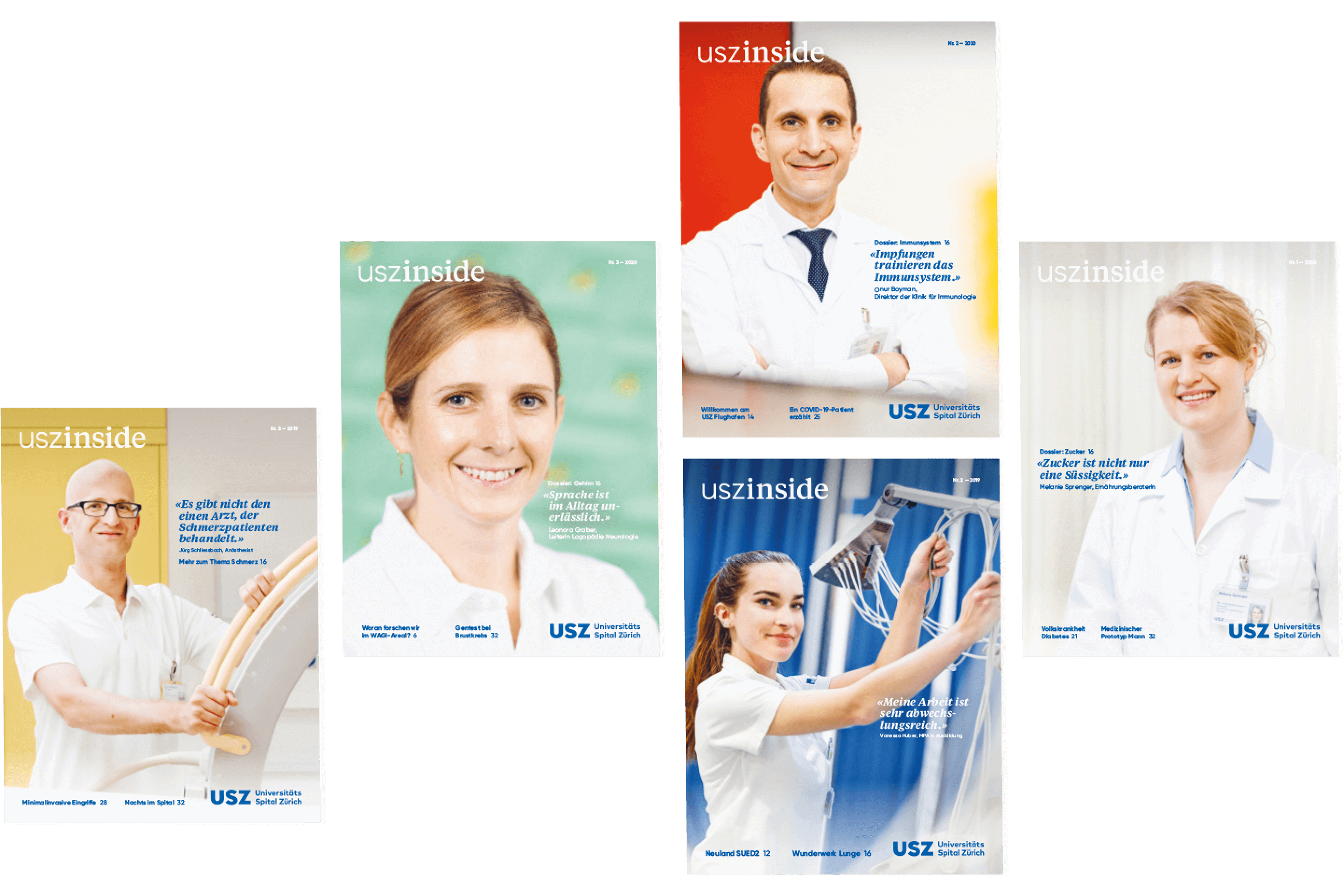 In den Jahren 2018 und 2019 wurde der visuelle Auftritt des USZ überarbeitet und neu positioniert. In diesem Rahmen durfte Partner & Partner das Mitarbeitendenmagazin «PULS» als zentrales Kommunikationsinstrument neu konzipieren und umsetzen. Das daraus neu entstandene Magazin «USZinside» geht über eine rein interne Massnahme hinaus und wendet sich neben den Mitarbeitenden nun auch an eine breitere Leserschaft, wie z.B. Patientinnen und Patienten, Besucher, Trägerschaft und Politik. Daher wurde auf eine Mantelpublikation mit Schwerpunkthemen gesetzt, kombiniert mit einem spezifisch internen Einhefter.