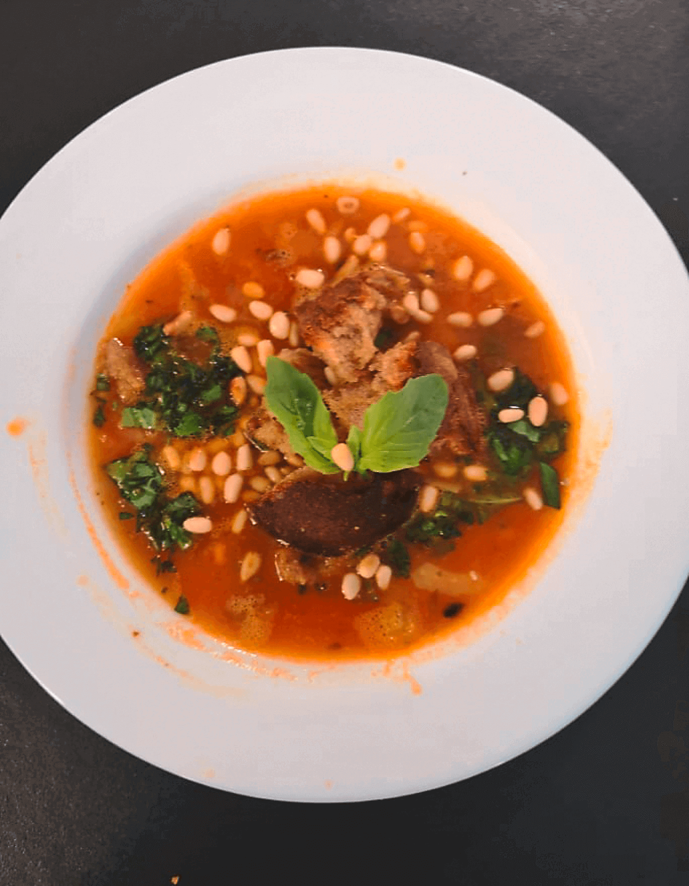 Zedernkerne kurz in der Pfanne anrösten. Suppe in Suppenteller oder -schalen schöpfen, etwas Basilikum darüber streuen, ein paar Zedernkerne dazugeben und mit dem knusprigen Brot servieren.