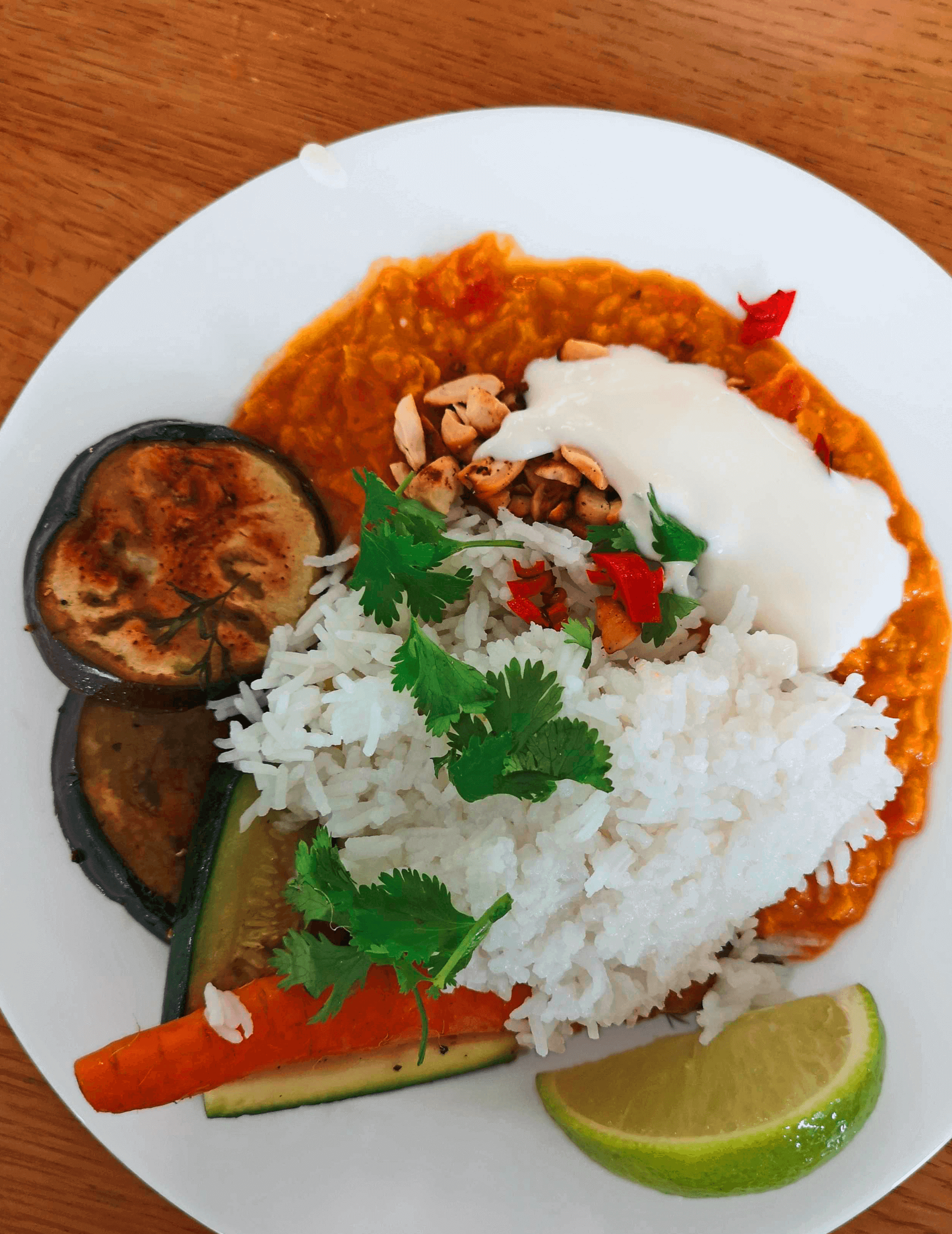 Auberginen und Zucchetti in grobe Stücke oder Scheiben schneiden. Mit den ganzen Karotten in eine Schüssel geben und mit Öl, Salz und Pfeffer gut mischen. Kreuz und quer auf mit Backpapier belegte Bleche legen und 20–25 Minuten in den auf 200 Grad vorgeheizten Backofen schieben. Reis gut waschen und nach Anleitung kochen oder Reiskocher verwenden. Limetten in Schnitze schneiden. Koriander samt Stielen grob hacken.